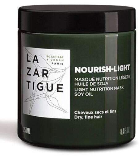 Le masque Nourish-Light de Lazartigue est conçu pour les cheveux secs et fins recherchant une hydratation prolongée sans perte de volume.Concentrée en huile de soja biologique, sa formule à 92% d’origine naturelle enveloppe la fibre de sa puissance fortifiante et nutritive sans l’alourdir. Revitalisée, la chevelure est nourrie et soyeuse, tout en légèreté.Parfait équilibre entre onctuosité et légèreté, sa texture généreuse se fond parfaitement avec la chevelure, procurant une sensation immédiate de confort. Sa fragrance délicate déploie des notes d’agrumes, de vanille et de cèdre pour un pur moment de bien-être.Sans sulfatesans siliconesans phenoxyethanolSans huile minéraleSans colorants artificielsVegan100% Made in FranceIndicationsCheveux secs et finsConseils d'utilisationAprès le shampooing, appliquer le masque sur l’ensemble de la chevelure démêlée, des longueurs jusqu'aux pointes. Laisser poser 5 minutes minimum. Démêler avec les doigts, ou à l’aide d’un peigne ou d’une brosse, puis rincer soigneusement.3 rituels beauté sont possibles selon vos besoins :- Pour une action rapide, après le shampooing, appliquer une noisette de masque sur cheveux essorés. Laisser poser 5 minutes et rincer. Les cheveux sont instantanément plus doux et éclatants de beauté.- Pour une action approfondie, appliquer en pré-shampooing sur cheveux secs. Répartir des longueurs jusqu’aux pointes et envelopper les cheveux dans une serviette chaude ou dans du film cellophane. Laisser poser 15 à 20 minutes. Rincer et procéder au shampooing. - Pour une hydratation extrême, mélangez une noisette de masque à une pipette d’Huile des Rêves. Appliquez sur les longueurs et pointes. Laisser poser en masque de nuit. Rincez abondamment le lendemain matin avant de faire un shampooing. Certificat92 % d'ingrédients d'origine naturellePrincipaux actifsHuile de soja biologiqueCompositionAqua (Purified Water), Behentrimonium Chloride, Cetearyl Alcohol, Glycerin, Dicaprylyl Carbonate, Glycine Soja (Soybean) Oil, Ceteareth-33, Cetyl Alcohol, Hydrogenated Coconut Oil, Myreth-3 Myristate, Orbignya Oleifera Seed Oil, Isopropyl Alcohol, Tetrasodium Edta, Tocopherol, Citric Acid, Glyceryl Stearate, Hydrogenated Lecithin, Peg-100 Stearate, Potassium Sorbate, Sodium Benzoate, Limonene, Linalool, Parfum (Fragrance)ConditionnementPot de 250 ml ...