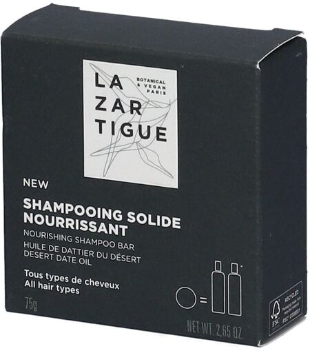 Enrichi en huile de dattier du désert, ce shampoing solide vegan nettoie en douceur, hydrate et nourrit tous les types de cheveux. Sa formule à 93% d’ingrédients d’origine naturelle, adoucit, assouplit et parfume les cheveux d’une fragrance abricotée gourmande.Action nourrissante – Cuir chevelu respecté – Sensorialité exceptionnelleCe shampoing solide offre une sensorialité exceptionnelle grâce à sa mousse généreuse et à sa signature olfactive gourmande aux notes d’abricot et de thé.Même s'ils paraissent sains, les cheveux normaux ont besoin d’un nettoyage doux et respectueux du cuir chevelu pour prévenir les dérèglements et les aider à maintenir un équilibre optimal face aux agressions internes (carences, fatigue, stress...) et externes (pollution, lavages trop fréquents…). Ce lavage doit être d’autant plus doux que les shampooings sont fréquents.Un nettoyage respectueux de la fibre et du cuir chevelu permet de préserver durablement la santé et la beauté des cheveux normaux.BénéficesSans sulfateSans silicone BiodégradableVeganIndicationTous types de cheveuxApplicationEn application quotidienne ou 2 à 3 fois par semaine :Le shampoing solide nourrissant Lazartigue peut être utilisé de deux façons différentes :1. Humidifier le shampoing solide, frotter-le dans les mains et déposer la mousse sur le cuir chevelu ou effectuer des petits mouvements circulaires directement sur cheveux mouillés pour le faire mousser.2. Masser et rincer.3. Penser à bien faire sécher votre shampooing solide après usage, afin de le conserver plus longtemps.Le conseil de notre expert : « Ajouter une goutte de l’Huile des Rêves Lazartigue dans la mousse pour plus de douceur et sensorialité. »IngrédientsHYDROGENATED VEGETABLE OIL, SODIUM COCOYL ISETHIONATE, AQUA/WATER/EAU, POLYGLYCERYL-4 LAURATE, GLYCERIN, BALANITES ROXBURGHII SEED OIL, ERYTHRITOL, PARFUM (FRAGRANCE), PCA GLYCERYL OLEATE, DECYL GLUCOSIDE, TETRASODIUM GLUTAMATE DIACETATE ...
