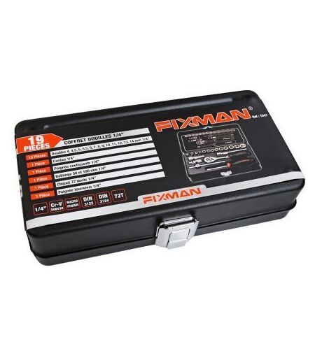 Coffret 19 pcs incluant : 13 douilles 4-4,5-5-5,5-6-7-8-9-10-11-12-13-14 mm 1 cardan 1/4" 1 poignée coulissante 1/4" Rallonges 50 et 100 mm 1/4" Cliquets 72 dents 1/4" Poignée tournevis 1/4" Chrome vanadium ...