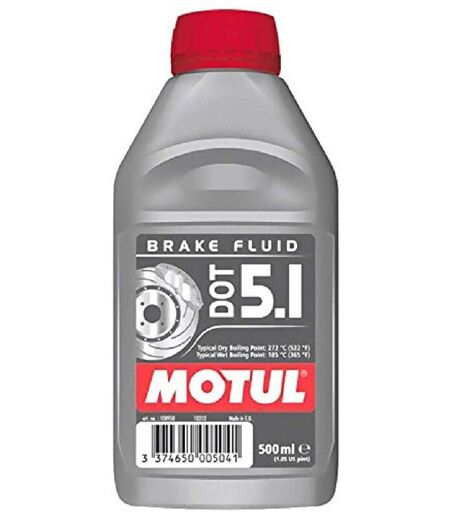 Description générale Liquide de frein synthétique Motul DOT5.1, conçu pour les systèmes de freinage hydrauliques. Ce liquide est compatible avec les types de freins et répond aux normes DOT5.1, DOT4 et DOT3. Spécifications techniques Volume : 500 ml Point d’ébullition 'sec' : 270 °C Point d’ébullition 'humide' : 185 °C Compatibilité et accessoires Compatible avec les systèmes de freinage équipés de freins ABS. Installation Pour une installation correcte, il est conseillé de suivre les recommandations du constructeur de votre véhicule. Assurez-vous de purger le système de freinage avant d'ajouter le liquide. Utilisation Utilisez le liquide de frein Motul DOT5.1 pour maintenir les performances de votre système de freinage. Vérifiez régulièrement le niveau et remplacez le liquide si nécessaire. ...