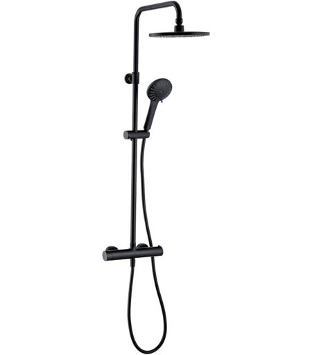 Description générale Cette colonne de douche moderne et élégante Black Roma Comfort est équipée d'un mitigeur thermostatique en laiton, garantissant un contrôle précis de la température et une sécurité maximale avec une fonction de blocage à 38 °C. Son design noir mat et ses finitions soignées apportent une touche contemporaine à votre salle de bain. La colonne est réglable en hauteur grâce à sa barre télescopique et comprend une pomme de douche large orientable ainsi qu'une douchette à main avec plusieurs jets, incluant des jets massants pour une expérience de douche agréable et personnalisée. Spécifications techniques Hauteur de colonne : de 900 à 1150 mm Pomme de tête : diamètre 23 cm Douchette : 5 jets avec fonction anti-calcaire et fonction SOFT Flexible noir anti-torsion : 1,5 m Mitigeur thermostatique avec cartouche Vernet, 100 % made in France Certification ACS pour l'eau potable Compatibilité et accessoires Compatible avec toute production d'eau chaude sanitaire Contenu de ...