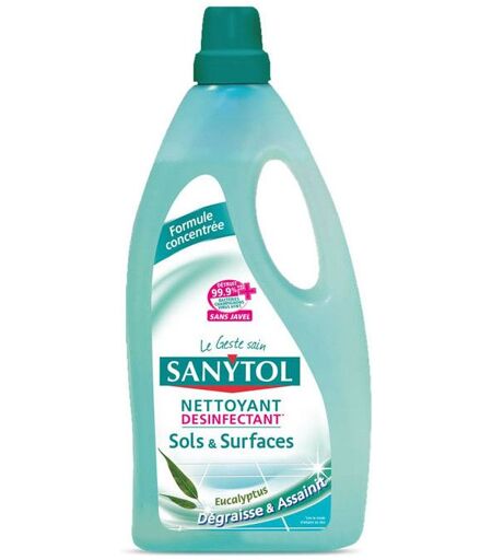 Sanytol l'expert de la désinfection sans javel, a développé une formule unique qui nettoie et degraisse toutes les surfaces lavable et garantit une désinfection parfaite en éliminant bactéries, virus et champignons. Sans Javel, elle ne tache pas, respecte les mat"riaux et laisse un parfum frais d'eucalyptus. Sans rinçage. ...
