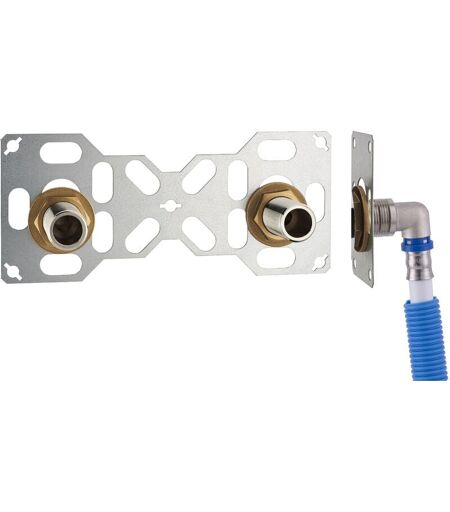 Description générale Kit platine pour installation de robinetterie murale bain ou douche femelle 3/4' (20x27) (F20x27) avec entraxe de 150 mm sur cloison creuse. Ce produit est conçu pour une installation facile et rapide, garantissant une étanchéité parfaite. Spécifications techniques Raccordement sur tube multicouche par raccord à sertir. Outillage nécessaire : pince à sertir avec mâchoires profil U. Produit breveté. Compatibilité et accessoires Compatible avec des tubes multicouches. Le kit contient : 1 platine, 2 contre-écrous, 2 raccords coudés, 2 raccords à sertir femelle écrou libre, 5 chevilles et vis pour plaque de plâtre. Installation Facile et rapide à installer. 3 encoches de réglage selon l'épaisseur du revêtement mural. Les raccords restent visitables. Utilisation Idéal pour l'installation de robinetterie dans les salles de bain ou douches, ce kit garantit une mise en place efficace et durable. ...