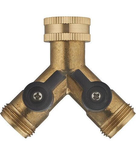 Nez de robinet en laiton Y à double sorties filetées mâle 3/4 (20x27). Sélection de la sortie d'alimentation par mini vanne à ouverture / fermeture 1/4 tour. Entrée femelle 3/4 (20x27)' (20x27) à écrou mobile pour une plus grande facilité d'installation et d'utilisation. Ecrou moleté pour pouvoir le visser à la main, avec joint imperdable. Résiste aux UV et aux intempéries. Solide, fabriqué en laiton, matière première recyclable. Idéal pour arroser à 2 endroits différents ou pour arroser tout en conservant la possibilité de puiser en parallèle. photos non contractuelles. ...