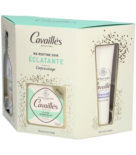 Ce coffret Cavaillès Ma Routine Soin Éclatante propose une sélection de 3 produits essentiels pour prendre soin de votre peau :Crème de douche nourrissante : Enrichie en surgras végétal pro-régénérant, elle nettoie tout en hydratant intensément pour une peau douce et protégée.Masque éclat visage : Nettoyant solide pour un teint lumineux, formulé avec 92 % d'ingrédients d'origine naturelle, sans savon.Crème miraculeuse multi-usages : Hydrate et régénère grâce à la Centella Asiatica BIO et aux bienfaits du surgras végétal.IndicationIdéal pour les peaux sensibles à la recherche de soins doux et respectueux pour le visage et le corps.ApplicationUtilisez la crème de douche au quotidien pour nettoyer et nourrir la peau.Appliquez le masque éclat sur le visage, laissez agir quelques minutes puis rincez.Hydratez avec la crème multi-usages en insistant sur les zones sèches ou sensibilisées.Coffret de 3 produits :Crème de douche (250 ml)Masque éclat visage (80 g)Crème multi-usages (150 ml) ...