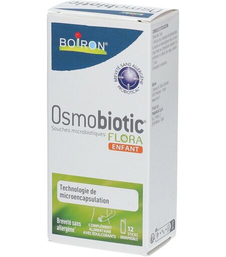 Complément alimentaire à utiliser dans le cadre d’une alimentation variée, équilibrée et d’un mode de vie sain. Osmobiotic® Flora Enfant est un complément alimentaire avec édulcorants contenant des souches microbiotiques. Formulé et breveté sans allergène, Osmobiotic® Flora enfant se compose de souches individuellement microencapsulées selon un procédé technologique breveté qui les protège de l’acidité gastrique et leur confère une résistance supérieure à des souches non microencapsulées. Elles parviennent ainsi vivantes en plus grand nombre dans l’intestin. Composition: Édulcorants : sorbitol, xylitol ; maltodextrine ; Souches microencapsulées* : Bifidobacterium breve BR03 (DSM 16604) 1 milliard par stick, Lactobacillus casei LC03 (DSM 27537) 500 millions par stick ; arôme naturel ; Anti-agglomérant : dioxyde de silicium. *Pour le comptage des cellules, l'utilisation de souches microencapsulées rend indispensable l'application d'une méthode analytique spécifique disponible chez Probiotical S.p.A Conseil d'utilisation: Enfant dès 3 ans : 1 stick par jour à dissoudre directement dans la bouche ou éventuellement dans un verre d’eau, de préférence en dehors des repas, pendant 12 jours. À renouveler si nécessaire. Précautions d'emploi: Une consommation excessive peut avoir un effet laxatif. Ne pas dépasser la dose journalière recommandée. Tenir hors de la portée des jeunes enfants. Les personnes atteintes d’une déficience immunitaire sévère ou d’une maladie chronique sont invitées à prendre l’avis d’un professionnel de santé avant utilisation. À conserver dans un endroit sec, à l’abri de la lumière et à une température ne dépassant pas 25 °C. Poids net: 19,2 g = 12 sticks orodispersibles de 1,6 g Fabricant: Boiron 2 avenue de l'ouest Lyonnais 69510 Messimy ...