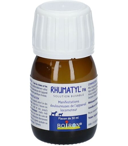 IndicationsEn spécifiant les espèces ciblesChez les chiens et les chats : médicament homéopathique traditionnellement utilisé dans le traitement des manifestations douloureuses de l'appareil locomoteur en complément du traitement spécifique s'il existe.Posologie et voie d'administrationUne goutte par kg de poids corporel, selon l'un des schémas suivants :troubles aigus : toutes les 2 heures les 12 premières heures puis matin, midi et soir, jusqu'à disparition des signes.troubles chroniques : matin, midi et soir les deux premiers jours, puis matin et soir. Faire des cures de trois semaines par mois pendant 3 mois.Administrer directement dans la bouche de l'animal à l'aide de la pipette graduée ou diluer dans l'eau de boisson ou mélanger à l'aliment.Précautions d’emploiConsulter un vétérinaire si les symptômes persistent.Durée de conservation : 5 ans.Ne pas conserver à une température supérieure à 25°C.CompositionUn mL contient : Substance(s) active(s) : Rhus toxicodendron 5 CHBryonia 5 CHDulcamara 3 CHApis mellifica 4 CHRuta graveolens 4 CHArnica montana 4 CHLedum palustre 4 CH aaExcipient(s) :Ethanol à 15 % QSP. 1 mLConditionnementFlacon de 30 ml ...