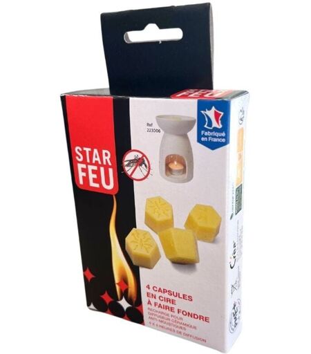 Recharge pour le DIFFUSEUR CERAMIQUE ANTI-MOUSTIQUES - 4 capsules en cire qui diffusent le répulsif antimoustique, à base de géraniol et d'eucalyptus citriodora, sous l'effet de la chaleur. Efficace extérieur et intérieur pour 16h de tranquillité (4 x 4 heures). Mode d'emploi : Encapsulation solide à faire fondre. Mettre une capsule sur le haut du diffuseur. Placer la bougie chauffe plat à l'intérieur. La chaleur va faire fondre la capsule et diffuser le répulsif pendant 4 heures. ...