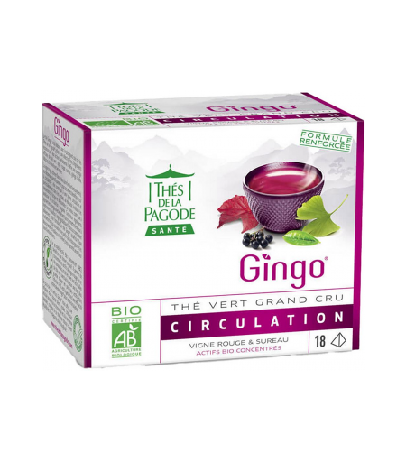 Le thé Gingo® bio 18 sachets pagode est un mélange raffiné élaboré par les Thés de la Pagode®, combinant du thé vert, de la vigne rouge, du sureau, du ginkgo biloba, de l’hibiscus, de la citronnelle et de la verveine. Grâce à ses ingrédients soigneusement sélectionnés, ce thé offre une synergie efficace pour favoriser une bonne circulation, réduire les sensations de fatigue et de lourdeur dans les jambes. Enrichi en flavonoïdes, la vigne rouge contribue à améliorer la circulation sanguine, tandis que le sureau agi en synergie avec le thé vert pour un retour à une circulation optimale.Ce thé bienfaisant bénéficie d'une cueillette fine, garantissant un taux élevé d'antioxydants. Grâce au procédé Actifs Bio Concentrés® breveté, les actifs de vigne rouge bio et de sureau bio sont concentrés et fixés sur les feuilles de thé vert sencha bio, assurant ainsi une infusion riche en principes actifs pour une efficacité optimale sur la circulation. De plus, le thé Gingo® offre une infusion à la teinte rosée, accompagnée d'une saveur équilibrée et acidulée, parfaite pour être dégustée chaude ou glacée.Pour une expérience gustative et bénéfique, laissez-vous séduire par le thé Gingo® bio 18 sachets pagode, une invitation à allier plaisir et bien-être.Le thé Gingo® bio 18 sachets pagode, élaboré avec soin par les Thés de la Pagode®, est une alliance parfaite de bienfaits pour la circulation et de saveurs équilibrées. Grâce à une composition soigneusement sélectionnée, ce thé offre une expérience gustative d'une douce teinte rosée, associée à une saveur équilibrée et acidulée. Cette infusion, pouvant être appréciée chaude ou glacée, est une invitation à la détente, tout en prenant soin de votre bien-être circulatoire.Découvrez le thé Gingo® bio 18 sachets pagode, une infusion bienfaisante aux multiples vertus, associant subtilement des ingrédients issus de l'agriculture biologique pour une expérience gustative et bénéfique incomparable. ...