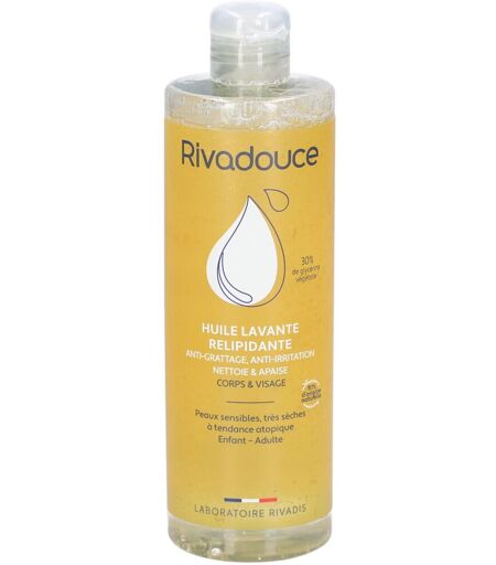 L’Huile Lavante Relipidante Rivadouce nettoie en douceur, nourrit intensément et protège les peaux sèches à tendance atopique. Sa formule sans sulfates et sans savon apaise les sensations de tiraillements pour offrir confort et souplesse au quotidien. Convient à toute la famille, dès 3 ans. Se mouiller le corps et/ou le visage, faire mousser puis rincer. Usage externe uniquement. Tenir hors de portée des enfants. Ne pas avaler. AQUA, GLYCERIN, COCO-GLUCOSIDE, DISODIUM COCOYL GLUTAMATE, CAPRYLYL/CAPRYL GLUCOSIDE, COCO-BETAINE, CAMELINA SATIVA SEED OIL, GLYCERYL OLEATE, HYDROGENATED PALM GLYCERIDES CITRATE, PARFUM, SODIUM CHLORIDE, XANTHAN GUM, SODIUM PHYTATE, TOCOPHEROL, SODIUM BENZOATE, PENTYLENE GLYCOL, CITRIC ACID. ...