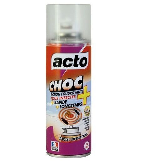 Description du produit Acto choc action foudroyante aérosol 100ml150m3. 60m². Insecticide polyvalent muni d'un diffuseur continu pour le traitement des locaux. C'est un insecticide puissant pour éliminer totalement les blattes, cafards, puces, punaises, mites, araignées, mouches, moustiques, acariens. ...