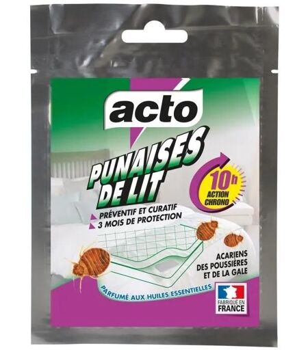 Plaquette punaises de lit Acto est préventif et curatif. Elle est répulsive et insecticide, élimine totalement les punaises de lit, les acariens des poussières et de la gale en moins de 10 heures après la pose. Elle offre une protection du lit de 10 à 12 semaines. Idéal pour les literies avec un parfum aux huiles essentielles. En cas de forte infestation, traiter les pièces concernées en volume avec l'aérosol Acto Spécial punaises de lit, puis placer les plaquettes. Le produit est parfumé aux huiles essentielles. Mode d'emploi : Placer une plaquette entre le matelas et le sommier, au centre du lit sous chaque personne. Soit une plaquette pour un lit simple, et deux plaquettes pour un lit double. Doubler le nombre de plaquette si le lit est infesté, soit 2 plaquettes par personne : en mettre une vers l'avant du matelas et une vers l'arrière. Pour un sommier en lattes, placer un objet solide et plat sur les lattes avant de placer la plaquette, afin d'éviter sa chute. L?effet du biocide débutera au bout de 6 heures d?utilisation. Précautions : Dangereux. Respecter les précautions d'emploi. Utilisez les biocides avec précaution. Avant toute utilisation, lisez l'étiquette et les informations concernant le produit. ...