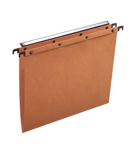 Dossiers-suspendus L'Oblique AZ AZO pour tiroir. Fond V. Kraft orange. Jupe en carte Canson orange 240 g/m2 rivetée. Suspension par barrettes plates en acier à embouts plastiques surmoulés. Mise en continu par boutons-pression métalliques. Entraxe : 33 cm. Boîte de 25 dossiers suspendus. Ref constructeur : 200000-O ...