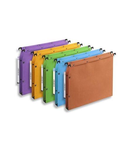 Dossiers-suspendus L'Oblique AZ AZV pour armoire. Fond 30 mm. Jupe en carte Canson 240 g/m2 rivetée. Coloris assortis : 5 dossiers de chaque couleur : orange, bleu, jaune, lilas, vert. Suspension par barrettes plates en acier à embouts plastiques surmoulés. Mise en continu par boutons-pression métalliques. Entraxe : 33 cm. Boîte de 25 dossiers suspendus. Ref constructeur : 500052 ...