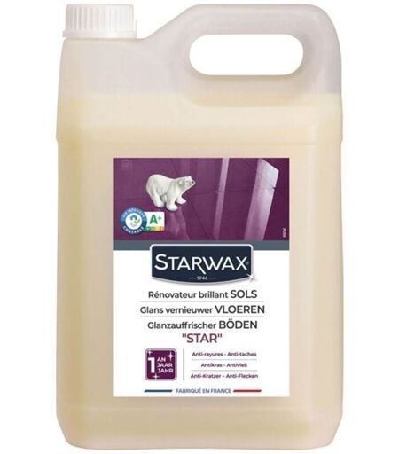 Description générale Le Rénovateur brillant Star pour sols intérieurs est un produit conçu pour protéger et faire briller vos sols. Il est efficace contre l'usure et les taches, offrant un brillant permanent jusqu'à un an. Adapté pour divers types de surfaces, il permet de rénover les sols anciens tout en protégeant les neufs. Spécifications techniques Marque : STARWAX Contenance : 5 L Effet : Grand brillant Résistance : Renforcée contre l'usure et les taches Compatibilité et accessoires Convient pour : carrelages (sauf émaillés ou polis), marbre, pierres naturelles, terres cuites, sols plastiques, parquets vitrifiés et sols stratifiés Ne pas utiliser sur : grès, céramique brute ou polie, marbres cristallisés, caoutchouc, et supports saturés en huile de lin Installation Avant d'appliquer le Rénovateur, assurez-vous que le sol est bien décapé, parfaitement sec et dépoussiéré. Verser le produit directement sur le sol et l'étendre en une fine couche à l'aide d'une serpillière humide et ...