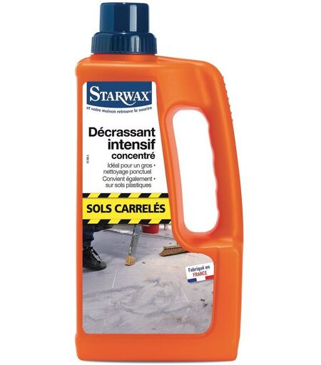 Idéal pour décrasser un carrelage après des gros travaux Élimine en profondeur les salissures tenaces Décrasse ponctuellement les carrelages très encrassés Pour carrelages poreux et non poreux Convient sur sols plastiques Le Décrassant intensif élimine en profondeur et sans effort les salissures tenaces (crasse, graisse, huile de vidange ...). Il est idéal pour le décrassage ponctuel de carrelages très encrassés, poreux ou non poreux (avant ou après travaux, déménagement, rénovation ...). Le Décrassant intensif convient aussi sur les sols plastiques. Comment utiliser le Décapant intensif pour carrelages ? Diluer 1/2L de Décrassant dans 5L d'eau. Appliquer avec un balai brosse muni d'une serpillière, en mouillant bien le sol. Laisser agir environ 10 mn, en insistant sur les endroits les plus encrassés. Rincer la serpillière puis éliminer les résidus. Bien rincer à l'eau claire. Recommandations Ne pas appliquer sur sols saturés en huile de lin, cire à l'ancienne, linoléum, parquet, sols peints, et tout support contre-indiqué par le fabricant. Peut altérer les protections pour sols : ne pas utiliser comme un produit d'entretien régulier sur des sols protégés. Ne pas réutiliser la serpillière avec un produit de protection. ...