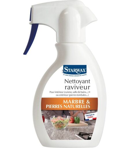 Idéal pour nettoyer et raviver les pierres naturelles Nettoie, ravive, fait briller Marbre et pierres naturelles Usage intérieur (cuisine,..) et extérieur (pierres tombales,..) Ph neutre : n'agresse pas Le Nettoyant raviveur pour marbre et pierres naturelles nettoie, ravive et fait briller le marbre et les pierres marbrières, granit, pierre bleue et autres pierres naturelles polies (sauf contre-indication éventuelle du fabricant). Il convient à un usage intérieur et extérieur. Avec un pH neutre, il n'agresse pas le marbre ou les pierres calcaires. Le Nettoyant raviveur marbre et pierres naturelles est conforme à la législation sur les produits de nettoyage pouvant se trouver au contact des denrées alimentaires. Comment utiliser le Nettoyant raviveur pour marbres et pierres naturelles ? Pulvériser à environ 20 cm de la surface. Etaler le produit avec une lavette ou une éponge non abrasive humide, puis laisser agir quelques minutes. Rincer pour éliminer les résidus. Essuyer avec un chiffon propre et sec. Recommandations Pour éliminer des voiles de tartre, utiliser le Rénovateur marbre et pierres naturelles Starwax, puis laisser agir quelques minutes. Rincer pour éliminer les résidus. Essuyer avec un chiffon propre et sec. ...