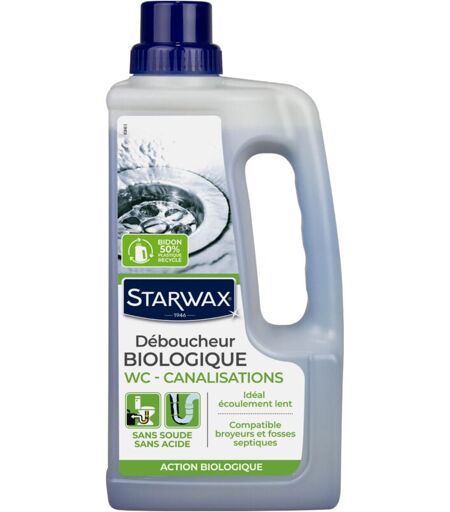 Description générale Le déboucheur biologique STARWAX est un produit efficace pour éliminer les bouchons organiques tels que la graisse, le savon et les déchets alimentaires. Sa formule sans acide ni soude agit biologiquement grâce à des enzymes et des bactéries, offrant ainsi une solution respectueuse pour vos canalisations, y compris celles reliées à une fosse septique. Spécifications techniques Marque : STARWAX Contenance : 1 litre Composition : Enzymes et bactéries Non corrosif pour les plastiques, le chrome et les métaux Fabrication française : Oui Compatibilité et accessoires Compatible avec éviers, lavabos, douches, baignoires et WC broyeurs Idéal pour canalisations reliées à une fosse septique Installation Pas d'installation requise. Prêt à l'emploi, il suffit de suivre les instructions d'utilisation. Utilisation Pour une efficacité optimale, il est recommandé d'utiliser le déboucheur le soir afin de laisser le produit agir toute la nuit. Voici les étapes d'utilisation : ...
