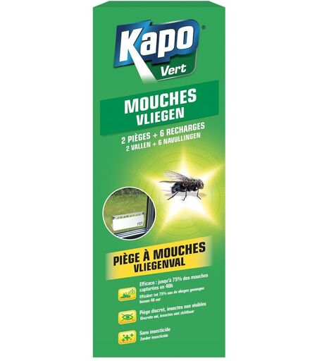 Idéal pour éliminer les mouches Sans insecticide 2 pièges + 6 recharges Efficace : jusqu'à 75% des mouches capturées en 48h Piège discret, les insectes ne sont pas visibles Pratique et esthétique Comment se débarrasser des mouches ? Les Pièges à mouches Kapo préservent votre confort tout en garantissant une efficacité optimale. En effet, jusqu'à 75% des mouches sont capturées en 48h sans insecticide ! Les pièges sont discrets : les insectes ne sont pas visibles. Attire et piège les mouches sans insecticide Le Piège à mouches Kapo Vert est pratique et esthétique. Il s'adapte sur tous types de fenêtres. Sa forme innovante, permet d' attirer les insectes par réflexion de la lumière et de les piéger sur la partie engluée. Sans insecticide. Comment utiliser le piège à mouches Kapo ? Sortir le piège de son emballage et presser sur les cotés pour le mettre en forme Décoller les deux bandes adhésives du piège et le fixer dans un coin de la fenêtre Enlever la protection de la bande engluée, puis la placer délicatement dans le piège sur la partie miroir Lorsque celle ci est saturée d'insectes, la retirer et la remplacer par une nouvelle bande ...