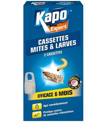 Idéales pour éliminer les mites des vêtements Agit immédiatement Protège contre de nouvelles infestations 2 cassettes avec indicateur de fin de vie Efficace sur les mites de vêtements et les larves Témoin de durée de vie Les larves et mites vestimentaires sont responsables de la détérioration des textiles. Les cassettes anti-mites Kapo tuent rapidement toutes les mites et leurs larves grâce à la diffusion d'une substance active. Elles empêchent les nouvelles infestations et protègent vos textiles pendant 6 mois. Pratique : le témoin de durée de vie vous indique quand il faut changer votre cassette. Avant toute utilisation, assurez-vous que celle-ci est indispensable, notamment dans les lieux fréquentés par le grand public. Privilégiez chaque fois que possible les méthodes alternatives et les produits présentant le risque le plus faible pour la santé humaine et animale et pour l'environnement. Comment utiliser les cassettes mites et larves avec témoin de durée de vie ? Séparer les deux cassettes à suspendre. Cassette contenant le produit actif (étiquette blanche) : retirer le film protecteur transparent, à l'aide de la languette. Cassette avec indicateur d'utilisation (étiquette rouge) : retirer la feuille de protection argentée à l'aide de la languette. Accrocher les deux cassettes ensemble et les placer de sorte que les fentes d'aération ne soient pas recouvertes. Les vêtements situées à proximité ne peuvent en aucun cas être décolorés. Après 6 mois, la solution de couleur rose se sera évaporée. Remplacer le diffuseur. ...