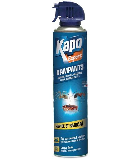 Idéal pour éliminer tous les insectes rampants Effet immédiat: tue par contact les insectes rampants Jet puissant Reste actif et protège jusqu'à 3 mois Utilisation "tête en bas" possible pour être encore plus direct et précis pour accéder aux endroits difficiles Existe aussi en format 750ml Cet aérosol éradique tous les types d'insectes rampants : cafards, blattes, cancrelats, punaises, araignées, fourmis, puces, perce-oreilles ... Innovation technologique, l'aérosol Kapo est muni d'une tête de type pistolet pour allier efficacité contre les insectes rampants et praticité : l'aérosol est utilisable même la tête en bas pour atteindre les endroits difficile d'accès. Utilisable directement sur les insectes ou en prévention sur les lieux de passage des insectes rampants. Longue durée : jusqu'à 3 mois de protection. Les produits KAPO insectes rampants sont "rémanents". Si vous les pulvérisez sur les lieux de passage habituels des insectes, ils continuent d'agir pendant plusieurs semaines. Avant toute utilisation, assurez-vous que celle-ci est indispensable, notamment dans les lieux fréquentés par le grand public. Privilégiez chaque fois que possible les méthodes alternatives et les produits présentant le risque le plus faible pour la santé humaine et animale et pour l'environnement. Comment utiliser l'Aérosol tous insectes rampants ? Agiter avant emploi. Tirer sur la languette plastique du pistolet pour l'utilisation. Pulvériser à raison d'1 à 2 pressions d'1 seconde à 30 cm, par mètre linéaire sur les lieux de passage (bas de murs, plinthes, encadrements de portes et fenêtres, tuyauteries, fissures, trous ...) ou pulvériser directement sur les insectes. Renouveler régulièrement cette opération, et retraiter les surfaces après chaque lavage. Pour stopper l'effet biocide, rincer les supports traités. ...