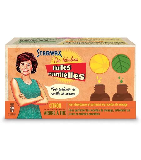 Idéal pour parfumer vos recettes maison The fabulous Huile essentielle de Citron pour désodoriser, faire briller et parfumer les recettes de ménage The fabulous Huile essentielle d'Arbre à thé pour entretenir les joints & endroits sensibles et parfumer les recettes de ménage Le Coffret The fabulous huiles essentielles Citron / Arbre à thé contient deux parfums : Citron : parfum tonifiant, stimulant, énergisant L'huile essentielle de Citron est idéale pour désodoriser (électroménager, poubelle, frigo, wc) et parfumer les recettes de ménage pour une maison qui sent bon (linge, lessive, nettoyant sol, cuisine ...). La petite histoire : Originaire de Chine ou d'Inde, l'huile est obtenue à partir du zeste. Il faut compter 3000 citrons pour obtenir 1kg d'huile essentielle. Arbre à thé : parfum frais alliant des senteurs mentholées, camphrées et terreuses (forêt de pin, eucalyptus). L'huile essentielle d'arbre à thé est idéale pour nettoyer les endroits sensibles aux bactéries (tels que les sols, poignées de portes, surfaces de cuisine, chambres, joints et endroits sensibles de salle de bains ...) et désodoriser (literie, linge). La petite histoire : Originaire du Sud-Est de l'Australie et déjà utilisée par les aborigènes pour ses propriétés médicinales et dont les feuilles d'arbre étaient utilisées jadis pour faire du thé. Attention : à ne pas confondre avec les feuilles de théier. Comment utiliser les huiles essentielles ? Les huiles essentielles ont été développées pour parfumer les recettes de ménage Starwax The fabulous. Chaque recette utilise une certaine quantité d'huile essentielle recommandée, celle-ci peut varier en fonction de la sensibilité des personnes. Vous retrouverez toutes les recettes Starwax The fabulous dans le nouveau livre "Mes recettes d'autrefois, à base d'huiles essentielles". ...