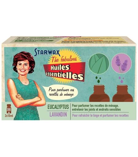 Idéal pour parfumer ses recettes 10ml d'Huile essentielle d'Eucalyptus pour parfumer les recettes de ménage, entretenir les joints et les endroits sensibles 10ml d 'Huile essentielle de Lavandin pour rafraîchir le linge et parfumer les recettes Le Coffret The fabulous huiles essentielles Eucalyptus / Lavandin contient deux parfums : Eucalyptus : parfum frais relaxant, apaisant, respirant & calmant, ravivant les énergies L'huile essentielle d'Eucalyptus est idéale pour entretenir les joints et les endroits sensibles (sols, poignées de portes, surface de cuisine, chambres, moisissures de salle de bains) et désodoriser (WC, pièce à vivre). La petite histoire : Originaire d'Australie, les aborigènes et colons l'utilisaient à des fins thérapeutiques. Introduit en Europe pour ses propriétés médicinales. Lavandin : parfum doux, frais et fleuri L'huile essentielle de Lavandin est idéale pour parfumer tous types de recettes de ménage pour une maison qui sent bon nettoyant sol, cuisine ...) et rafraîchir le linge (lessive). La petite histoire : Le lavandin est un hybride de la lavande (la lavande est plutôt réservée à un usage thérapeutique) et lui ressemble dans la forme et dans le parfum des fleurs. Largement cultivé en France, le lavandin possède une odeur fortement agréable et est reconnu pour apporter du calme au corps et à l'esprit. Comment utiliser les huiles essentielles ? Les huiles essentielles ont été développées pour parfumer les recettes de ménage Starwax The fabulous. Chaque recette utilise une certaine quantité d'huile essentielle recommandée, celle-ci peut varier en fonction de la sensibilité des personnes. Vous retrouverez toutes les recettes Starwax The fabulous dans le nouveau livre "Mes recettes d'autrefois, à base d'huiles essentielles". Comment fabriquer mon parfum de linge avec l'huile essentielle de lavandin ? Versez 4 cuillères à soupe d'alcool ménager dans un spray Ajoutez 1/2 verre d'eau Puis ajoutez 10 à 50 gouttes d'huiles essentielles de lavandin selon la rémanence souhaitée Mélangez bien et pulvérisez directement sur le linge Comment nettoyer les sols carrelés avec l'huile essentielle Eucalyptus ? Mélangez dans 1 litre d'eau chaude : 2 cuillères à soupe de cristaux de soude 1 cuillère à soupe de savon de Marseille Ajoutez 30 gouttes d'huile essentielle d'eucalyptus Utilisez comme un nettoyant classique avec une serpillère Rincez bien à l'eau claire ...