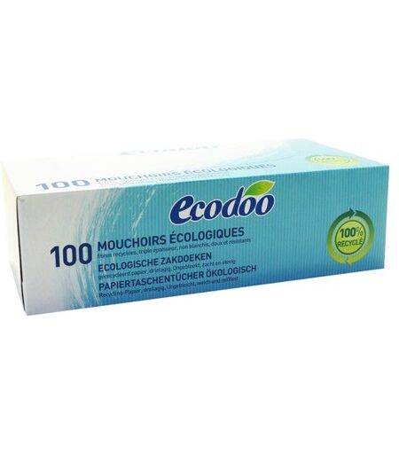 Boîte de 100 mouchoirs 100% fibres recyclées. Triple épaisseur, doux et résistant Cette boîte en carton recyclé contient 100 mouchoirs triple épaisseur, doux et résistants, composés à 100% de fibres recyclées. Les + produit : . 3 épaisseurs . Doux et résistants . 100% fibres recyclées . Non blanchis . Boîte en carton recyclé et imprimé avec encres végétales Caractéristiques : Composition : Fibres 100% recyclées. Embalalge carton recyclé e imprimé avec encres végétales Contenu : 100 mouchoirs Fabrication : UE ...
