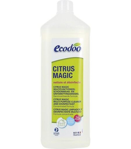 Le nettoyant Citrus magic d'Ecodoo est idéal pour nettoyer et désinfecter les appareils ménagers, poubelles, éviers, lavabos, baignoires, carrelages,... Les + produit : . Prêt à l?emploi . Nettoie, dégraisse, assainit, désodorise . Multi-usage . Bactéricide selon norme EN 1276 . Sans colorant . Non testé sur animaux Caractéristiques : Composition : >30% eau, 5 ? 15% Parfum émulsion bactéricide avec ammonium quaternaire (CAS N°68424-85-1 à 0.2% m/m TP2, TP4), *0,1% du total des ingrédients sont issus de l?Agriculture Biologique ...