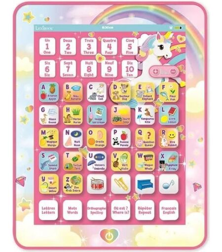 LEXIBOOK - Tablette Éducative & Bilingue Licorne Français, Anglais - Tablette Parlante avec Écran Tactile Appuyez sur n¿importe quelle touche et la tablette prononcera la lettre, le chiffre ou le mot correspondant. Parfaite pour les plus jeunes ! 5 Modes pour des Heures de Jeu Alimentation : 3 x AAA/LR03 de 1.5V Piles de démonstration fournies ...