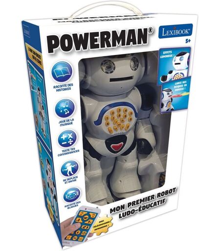 Le Robot Interactif Powerman Interactif : Le robot Powerman parle, chante, danse et joue de la musique avec de nombreux effets sonores et lumineux ! Educatif : Répondez à ses devinettes et devenez incollable sur les nombres, les animaux et bien d'autres sujets fascinants ! Raconte des Histoires : Découvrez les fabuleuses Fables de La Fontaine racontées par Powerman®, ainsi que ses blagues hilarantes ! Fun : Il lance des disques en mousse ! Enregistrez-vous et il répétera tout ce que vous dites avec sa voix de robot ! Avec Télécommande : Contrôlez Powerman vers l'avant, l'arrière, à droite et à gauche. Il se déplace dans toutes les directions ! Caractéristiques Alimentation : 5 piles LR6/AA pour le robot (non incluses) + 2 piles LR6/AA pour la télécommande (non incluses). Inclus : 1 robot + 1 télécommande infrarouge + 1 manuel d'instructions + 9 disques en mousse. ...