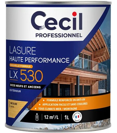 Lasure haute performance LX530 1L CECIL PROFESSIONNEL - Haute performance : spécialement étudiée pour décorer et protéger tous les bois extérieurs sous expositions fortes aux intempéries et aux UV (mer/montagne). - Formule renforcée en résine : sans traces de reprises. - Excellente accroche : peut s’appliquer par temps humide sur tous types de supports - Excellent confort d’application La lasure LX530 est spécialement étudiée pour décorer et protéger tous les bois extérieurs sous expositions fortes aux intempéries et aux UV (exposition plein sud/situation mer montagne… ). Sa formule renforcée en résine (Haut Extrait Sec) apporte une excellente durabilité à long terme et une souplesse du film qui suit les variations dimensionnelles du bois. Le mélange de résines alkydes et son aspect satiné réchauffent le bois et donnent une belle finition et un beau tendu du film. De formule gélifiée très agréable à appliquer, elle permet une application sans coulure. A base de solvants désaromatisés ...