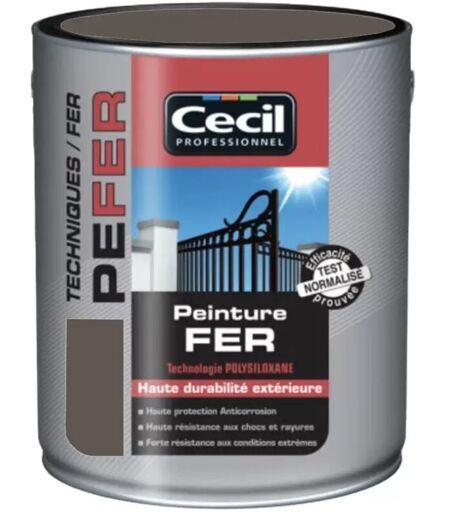 La Peinture Fer Cécil Professionnel PE FER Brun foncé est une peinture laque antirouille pour la protection et la décoration des métaux ferreux et non ferreux : portails, clôtures, garde-corps, ferronneries, mobilier de jardin, radiateurs, matériel agricole…. Cette peinture anti-rouille Cécil Professionnel PE FER contient des inhibiteurs de rouille exempts de matière toxique qui renforcent la protection anti-corrosion. ...