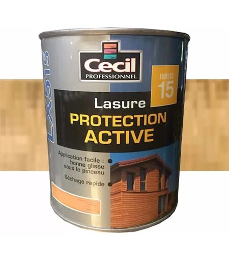 La Lasure LX515 Protection Active CECIL Chêne clair est une lasure bois professionnelle de finition pour la décoration et la protection de tous bois extérieurs : bardage, chalets, portes, volets, fenêtres, charpentes, barrières, mobiliers de jardin. Lasure acrylique, hydrofuge et microporeuse. Indice 15: décore et protège durablement les bois extérieurs sous exposition modérée aux UV et intempéries. ...