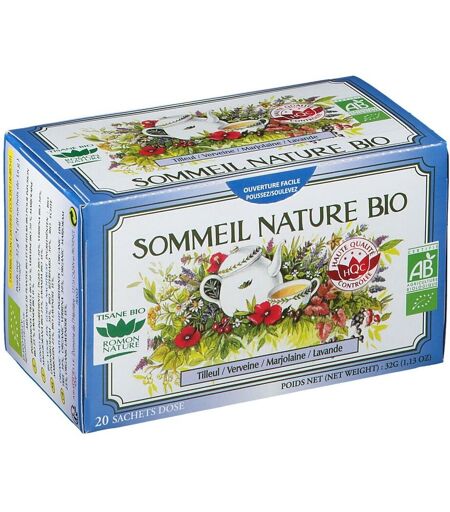 Il est important d'avoir une alimentation variée et équilibrée et un mode de vie sain.Tilleul bio, Verveine bio, Marjolaine bio, Lavande bioPour favoriser l'endormissement et le sommeilComposition: Verveine Bio 30%, Tilleul Bio 30%, Marjolaine Bio 25%, Lavande Bio 15%Valeur nutritionnelle: Par sachet Energie 0 kcal / 0 kj Matières grasses 0,1 g Acides gras saturés 0 g Glucides 0,2 g Sucres 0,05 g Protéines 0,05 g Sel 0,05 g Conseil d'utilisation:Laisser infuser le sachet-dose sommeil Nature Bio dans une tasse d'eau chaude pendant 3 à 4 minutes. Vous pouvez consommer 4 tisanes par jour.Précautions d'emploi:Cette tisane n'est pas un médicament. Ne pas donner aux enfants de moins de 5 ans. Poids net: 20 sachets = 32 gFabricant: ARAQUELLE BAS Domaine de l'Heritière 13116 Caza en Provence France ...