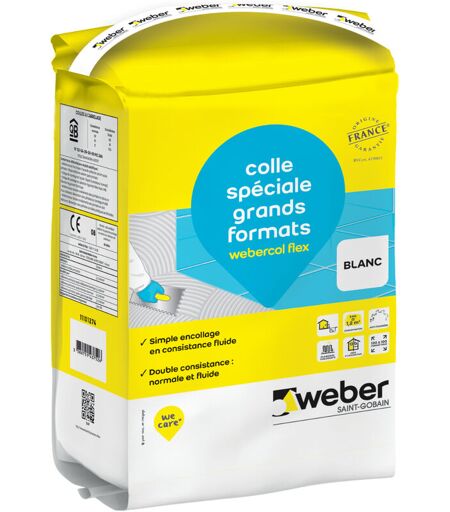 Colle à haut rendement, spéciale grands formats et planchers chauffants. 2 colles en 1 : colle normale ou fluide qui permet 20 % de temps gagné sans double encollage. Pose de carreaux jusqu’à 10 000 cm² (1m x 1m) qui est adaptée aux supports les plus exigeants : sols chauffants, façades, vides sanitaires... DOMAINE D’UTILISATION : Pose de carrelages et pierres naturelles (marbre, pierre calcaire, granit) de toutes porosités, de tous formats (voir tableau ci-contre), sur murs et sols intérieurs et extérieurs. Pose de carrelages en bassin et piscine à usage privatif ou collectif. PRECAUTION D’UTILISATION : Pour utiliser ce produit en toute sécurité, afin de protéger votre santé et l’environnement, respectez les conseils de prudence qui sont étiquetés sur l’emballage. Les consignes de sécurité, pour un emploi sûr de ce produit, sont disponibles dans la Fiche de Données de Sécurité (FDS), accessible sur quickfds.fr/weber. Les informations relatives aux dangers des produits figurent à la ...