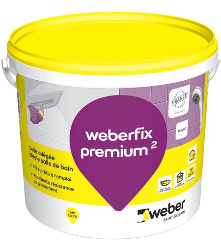 " Adhésif allégé spécial salle de bains et la pâte est prête à l’emploi. Haute résistance à l’humidité avec application facile grâce à sa texture onctueuse. Collage direct sur ancien carrelage et peinture. DOMAINE D’UTILISATION : Pose de carrelages, terres cuites et pierres naturelles de petit à grand format, sur supports muraux intérieurs, neufs ou anciens, et sur paillasses, tables et plans de travail. Pose de plaquettes de parement ou de petits éléments céramiques sur murs extérieurs (jusqu’à 6 m de haut, utilisation hors DTU). Pose sur système de protection à l’eau. LIMITE D’EMPLOI : Ne pas appliquer : sur sols intérieurs et extérieurs, dans des locaux très humides (piscines, laveries industrielles...). Pour la pose de carreaux de porosité réduite sur support non absorbant (exemple : émaux sur carreaux de grès) ; dans ce cas, weberfix premium ² sécherait lentement, l’eau contenue dans l’adhesif s’éliminant difficilement. Sur métal et sur supports en mauvais état. Sur murs ...