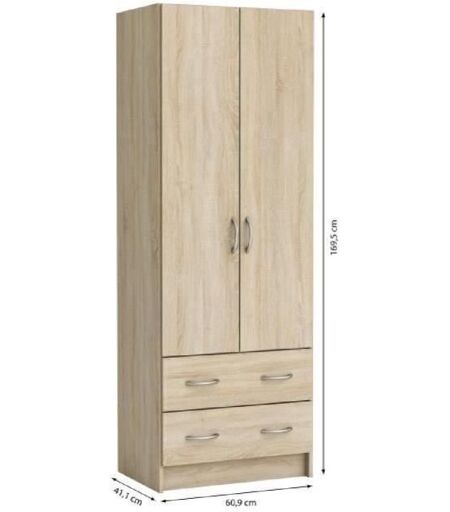 DUAL Armoire de chambre adulte en panneaux de particules revetus de papier décor chene brossé - Style et design classique - Comporte 2 portes avec 3 rayons L 58 x P 40 cm amovibles et réglables sur 5 niveaux, 2 tiroirs montés sur coulisses métal - Poignées en plastique coloris gris alu - Fond d'armoire en lin tissé - Dimensions L 61 x P 41 x H 170 cm - Fabrication française. ...