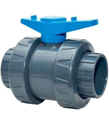 Pièce plomberie pour piscine. Vanne à coller en PVC Ø 63 mm - AquaZendo. Fabriqué en PVC PN16 BARS. Convient à une pression maximale de 16 bars. Femelle à coller, siège de bille réglable double union et poignée bleue. Caractéristiques techniques Couleur : Gris Marque : FITT Matière(s) : PVC Raccords : 63 mm Type de produit : Vanne ...