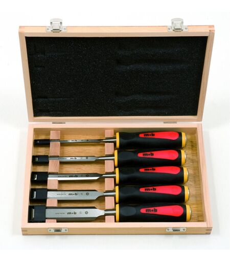 Contenant : coffret en bois. Ciseaux : Lame forgée en acier à haute teneur en carbone et en chrome. Dureté 59-63HRC. FINITION ET MARQUAGE - Brunissage et vernis de protection. - Marquage précis des dimensions pour une identification facile. PRÉCISION - Usinage fin "des faces" pour un taillant de grande rectitude agressif et durable. - Angle à 25°. SÉCURITÉ : Embout de protection. Manche ergonomique. Zone de frappe en métal : ne champignonne pas, ne se se déforme pas. Elastomère confortable - Corps en polypropylène. Posé, il ne roule pas. La soie ne vrille pas dans le manche grâce à son assemblage à section angulaire. 6 -10 -15 -20 -25 mm. ...
