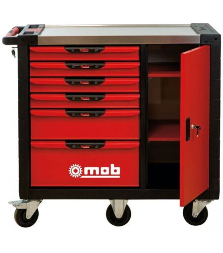 Servante XLINER avec armoire et 6 tiroirs de chez MOB Plan de travail bien large de plus d'1m Plateau acier inoxydable 2 côtés bi-matière aménagés : vide-poches, emplacements tournevis Poignée bi-matière intégrée à la construction du plateau Construction robuste Charge statique : 1000 kg. Résistance charge tiroirs : 30 kg Pratique : chaque tiroir peut accueillir 3 modules Pas de nécessité de prévoir des modules de calage Les tiroirs sont équipés de tapis de fond Armoire équipée de 2 tablettes réglables en hauteur Fermeture centralisée des tiroirs par clés et 2èmes clés pour l'armoire Côtés perforés pour accueillir des accessoires : poubelle, porte-flacons et porte-documents Bumpers plus souples Peinture epoxy Nouvelle roues plus souples pour une meilleure mobilité 4 roues orientables et 2 roues fixes Pivote à 360° Poids : 80kg Garantie 10 ans ...