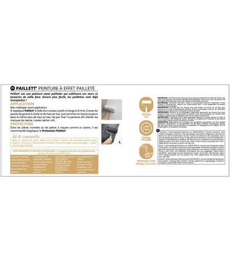 DESCRIPTION PRODUIT La peinture PAILLETT est une peinture pailletée qui sublimera vos murs et boiseries de mille feux. Encore plus facile, les paillettes sont déjà incorporées dans peinture PAILLETT ! Elle est sèche en ±4h. CONDITIONNEMENT 2L BÉNÉFICES Facile d'application, Mat profond SUPPORTS Boiserie, Mur COLORIS Cinecitta, Hollywood, Palme, Oscar, Star, Studio, Princesse, Riviera, Lux et Polar RENDEMENT ±15m² COMMENT L'UTILISER ET L'APPLIQUER ? PRÉPARATION Paillett' s'applique sans primaire sur supports déjà peints et sur bois non tannique. Sur plâtre, plaques de plâtre ou dérivés : appliquez la Primaire avant peinture. APPLICATION Appliquez Paillett' à l'aide d'un rouleau à poils mi-longs. Laissez sécher ±4h. PROTECTION Si vous souhaitez protéger Paillett' appliquez le Protecteur Paillett'. ...