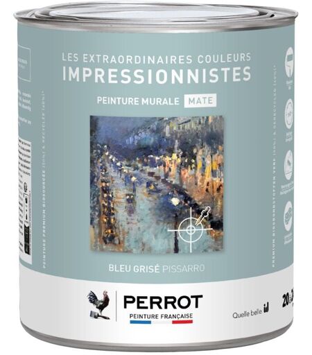 Les Impressionnistes sont les plus grands coloristes de tous les temps. Offrez à vos murs leurs extraordinaires couleurs intemporelles. Elles s'harmonisent aussi bien avec des intérieurs modernes que classiques. La peinture PERROT est une peinture murale mate premium biosourcée et recyclée (Formule contenant plus de 50% de carbone biosourcée selon la norme EN 16640 (issue de la biomasse) et 40% d'ingrédients issus du recyclage (sur le sec peinture). Caractéristiques – Conditionnement : 500ml et 2L – Rendement ± 12m² par litre – Outil d'application : rouleau – Finition mate PRÉPAREZ VOS SUPPORTS POUR UN RÉSULTAT IMPECCABLE Le support doit être sain, propre et sec. Sur anciennes peintures : lessivez et rincez à l'eau. Appliquez une couche de primaire à l'aide d'un rouleau ou d'une brosse large. Sur plâtre, plaques de plâtre et fonds poreux : poncez et dépoussiérez. Faites une 1ère application de primaire diluée avec 5% d'eau. Laissez sécher ±4h avant de faire une 2ème application pure. ...