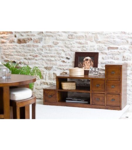 Meuble TV escalier marron bois Mindi. Dimensions : 105 x 38 x 56 cm. Article en Mindi et Contreplaqué. Une touche ethnique, une ligne contemporaine pour rendre l'atmosphère chaleureuse. Le meuble TV idéal pour tous ceux qui aiment les beaux meubles en bois ! Réalisé en Mindi, bois exotique et en contreplaqué il apportera une touche ethnique à votre intérieur. Il se mariera à merveille avec tous les types de déco grâce à sa ligne épurée, une teinte chaleureuse et une belle finition par un vernis à base de gomme laque pour un toucher velouté. En forme d'escalier, il a un plateau allongé pour vous permettre de poser votre écran de télévision et 2 niches pour mettre vos lecteurs DVD, décodeurs et adaptateurs TNT… Il possède également 6 tiroirs pour ranger les télécommandes, bien sur, et tout votre matériel Hifi vidéo. Meuble monté ...