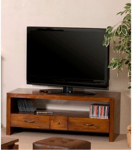 Meuble TV marron 2 grands tiroirs 1 petit tiroir bois Mindi. Dimensions : 120 x 50 x 48 cm. Article en Mindi et Contreplaqué. Une touche ethnique, une ligne contemporaine pour rendre l'atmosphère chaleureuse. Très belle réalisation ce meuble TV bas de style exotique ! Composé d'une niche et de 3 tiroirs de rangement traversant, ce meuble TV aux lignes épurées sera parfait dans votre salon. Il est réalisé en bois exotique Mindi et Contreplaqué avec une belle finition patinée (gomme laque). Meuble monté ...