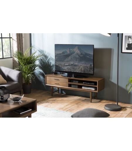 Meuble TV marron 2 tiroirs 2 niches bois Mindi. Dimensions : 140 x 35 x 50 cm. Article en Mindi et Contreplaqué de Mindi. Vous retrouverez l'ambiance à la fois chaleureuse et nordique avec notre gamme Lara. Epurée, lumineuse, Lara vous apporte une touche de douceur avec sa teinte noyer. Meuble monté, pieds à visser ...