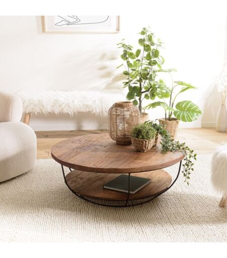 Macabane - sixtine - Table basse coque ronde 100x100cm double plateau teck recyclé métal noir