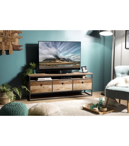 Macabane - sixtine - Meuble tv marron 3 tiroirs Teck recyclé Acacia Mahogany recyclé et métal noir