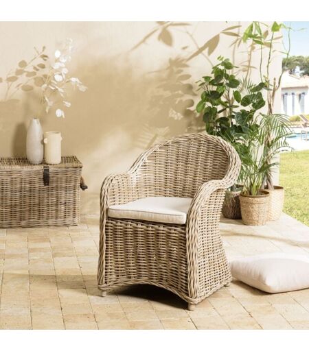 Fauteuil en kubu avec coussin d'assise blanc. Article en rotin / kubu/mousse polyuréthane/polyester, coton, viscose. Dimension 67 x 66 x 85 cm. Produit d'intérieur et/ou d'extérieur à condition qu'il soit utilisé sous un espace couvert à l'abri de la pluie. Offrez-vous le confort et l'élégance de ce fauteuil en kubu, avec son coussin d'assise blanc. Un choix parfait pour ajouter une touche naturelle et raffinée à votre intérieur. Meuble monté ...