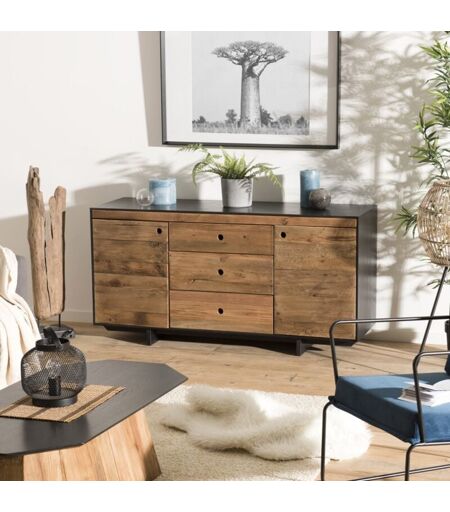 Buffet 2 portes 3 tiroirs bois Pin recyclé naturel et noir. Dimensions : 150 x 48 x 76 cm. Article en Pin recyclé/Contreplaqué. Cet article est composé de bois recyclé ! Le bois recyclé est un bois récupéré de vieilles charpentes, de coques de bateaux ou tout bois de récupération ayant déjà eu une longue vie. C'est ce qui lui donne cet aspect vieilli et authentique avec ses imperfections qui font tout son charme. Acquérir du bois recyclé est une initiative écoresponsable qui permet de lutter contre la déforestation. Ce buffet se marie avec de nombreux styles de décorations. Doté de deux portes latérales et de trois tiroirs centraux, il offre une grande capacité de rangement. Le pin recyclé naturel et noir lui donne beaucoup de cachet grâce à ses imperfections. Meuble monté ...